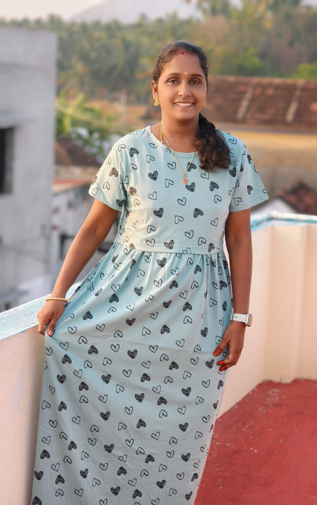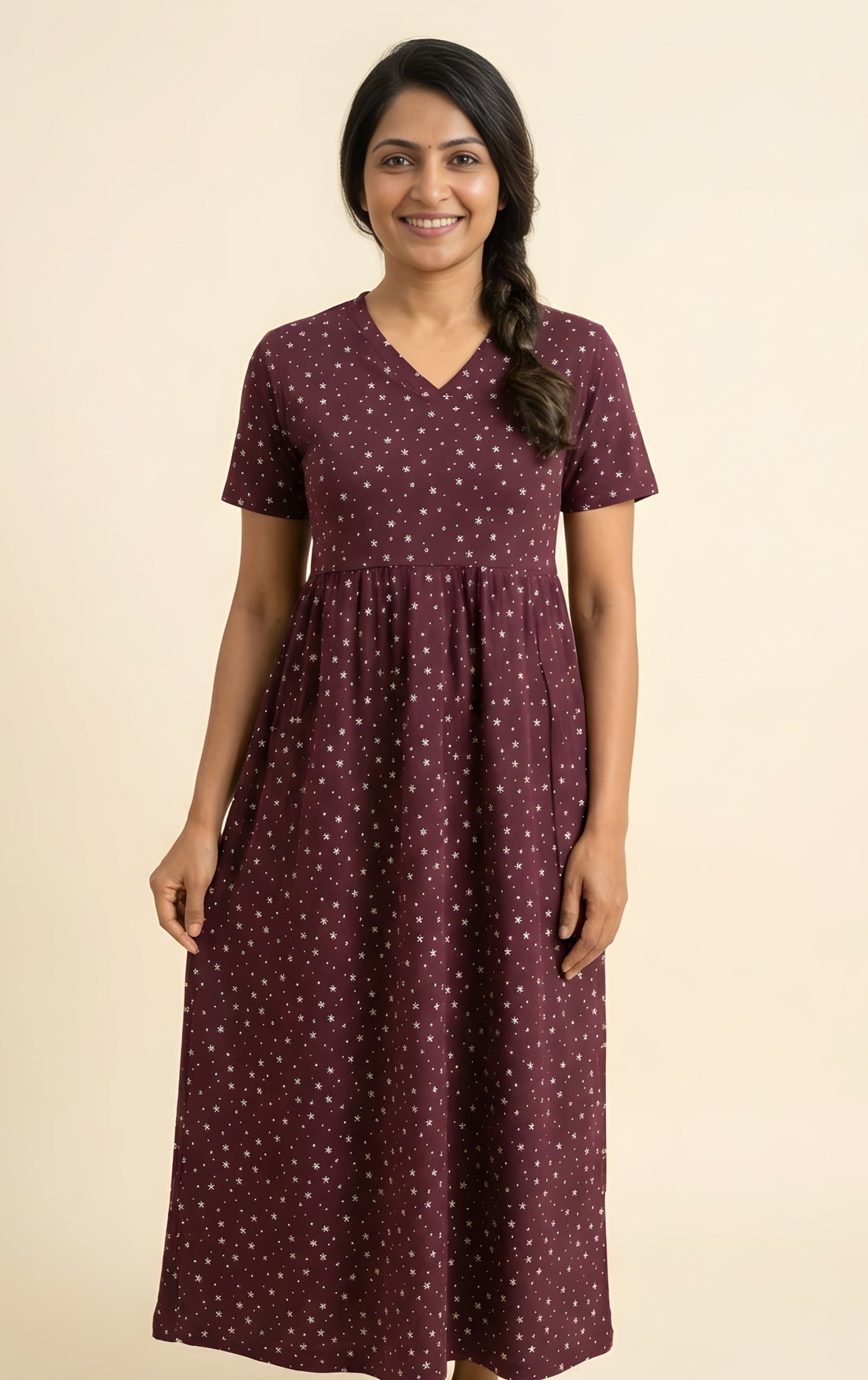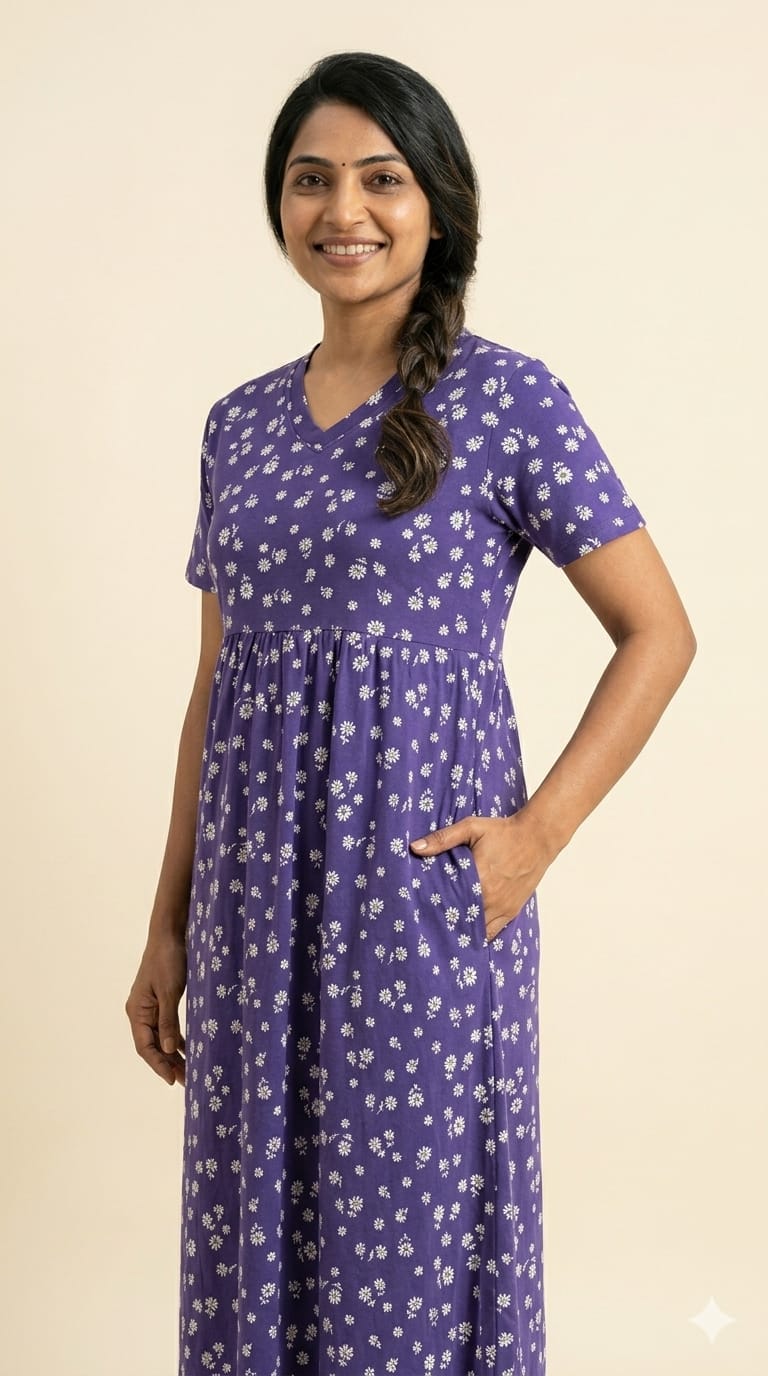 This non-feeding maxi is my favourite at home. The cotton is breathable and light, perfect for Madurai’s climate. I’ve washed it many times — no fading, no shrinking.